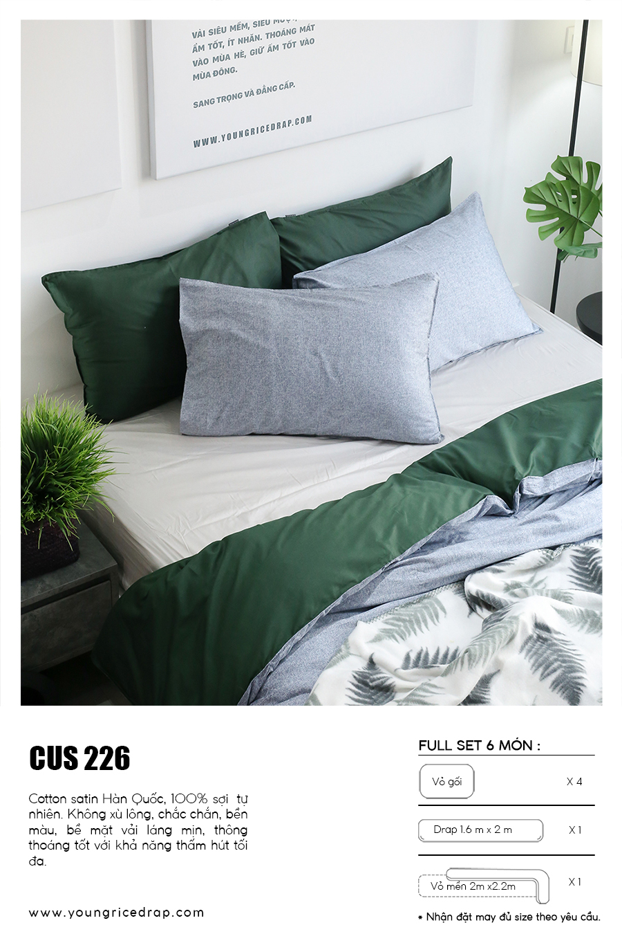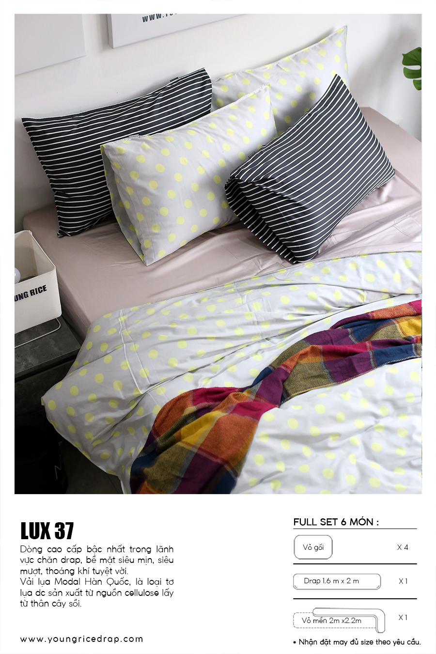 LUX series: This is the most advanced product at Young Rice Drap, made of material 100% was silk Modal (MOC oak fabric), This is a very high quality material used to make the most fashionable products, LUX products for very good smoothness and excellent luster are products that many people believe in., In addition to products for the bedroom of the brothers and sisters are very valuable to decorate the workspace, hotel space, luxury villa. >> Products available price word 3.690.000 copper.