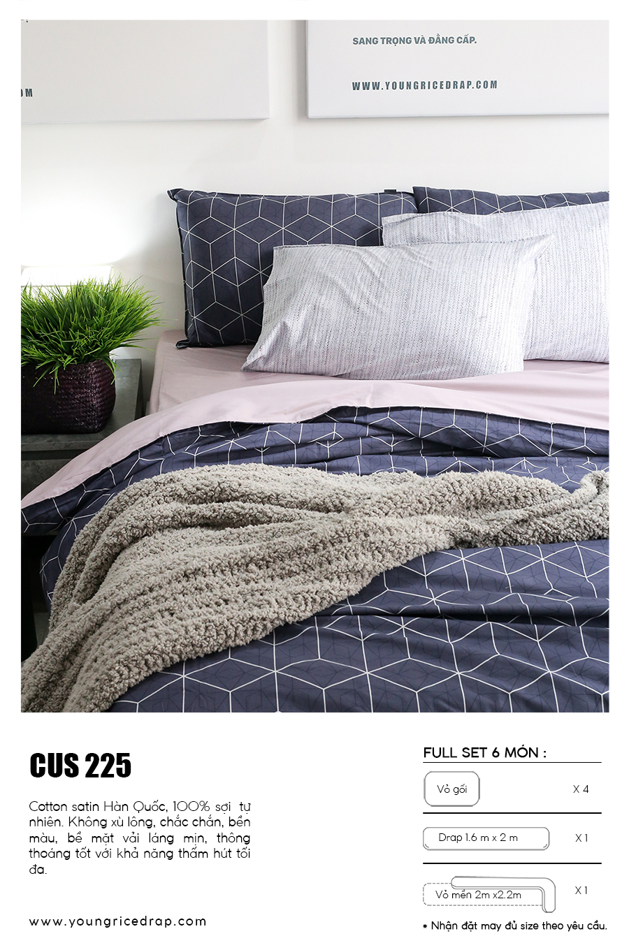 CUS series: This is a product made of material 100% Cotton yarn 40S imported from Korea, Skin-friendly fabric, health safety. Also unique designs, Fashion gives your bedroom special space, attractive >> Products available price word 1.540.000 copper.
