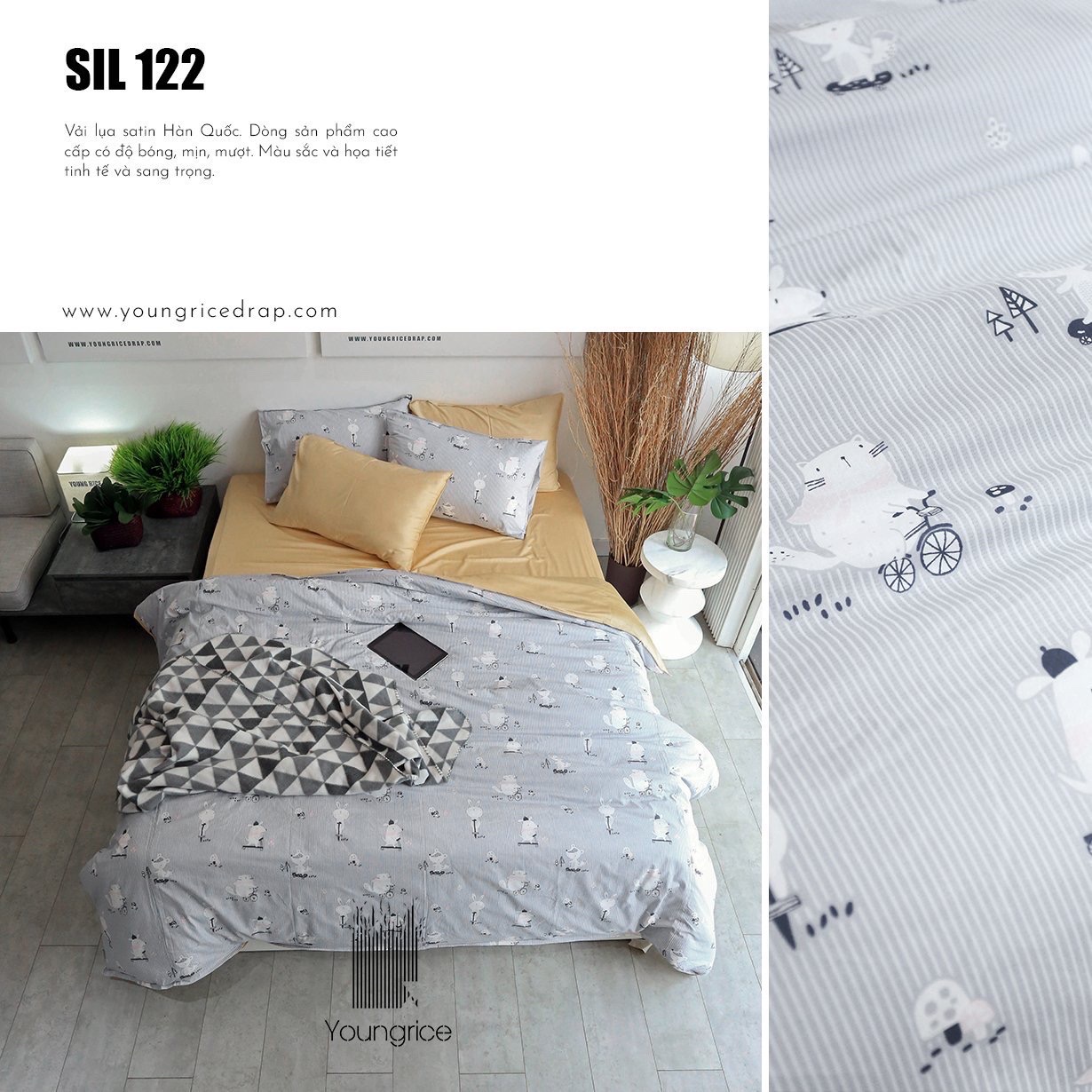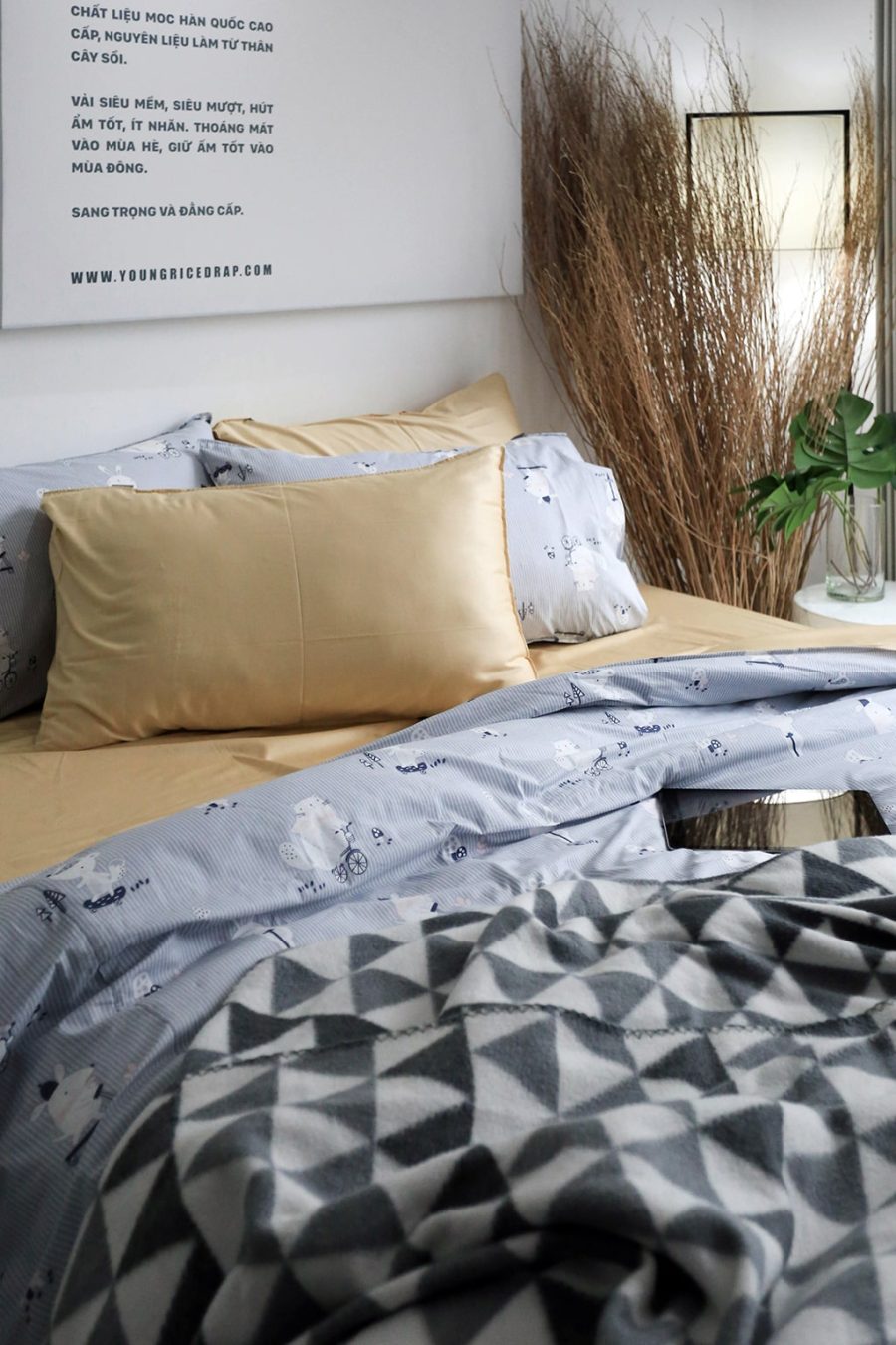 – 2 vỏ gối 50×70 cm : vàng mỡ gà ( hoặc 1 vỏ gối ôm 75 x 105 cm)