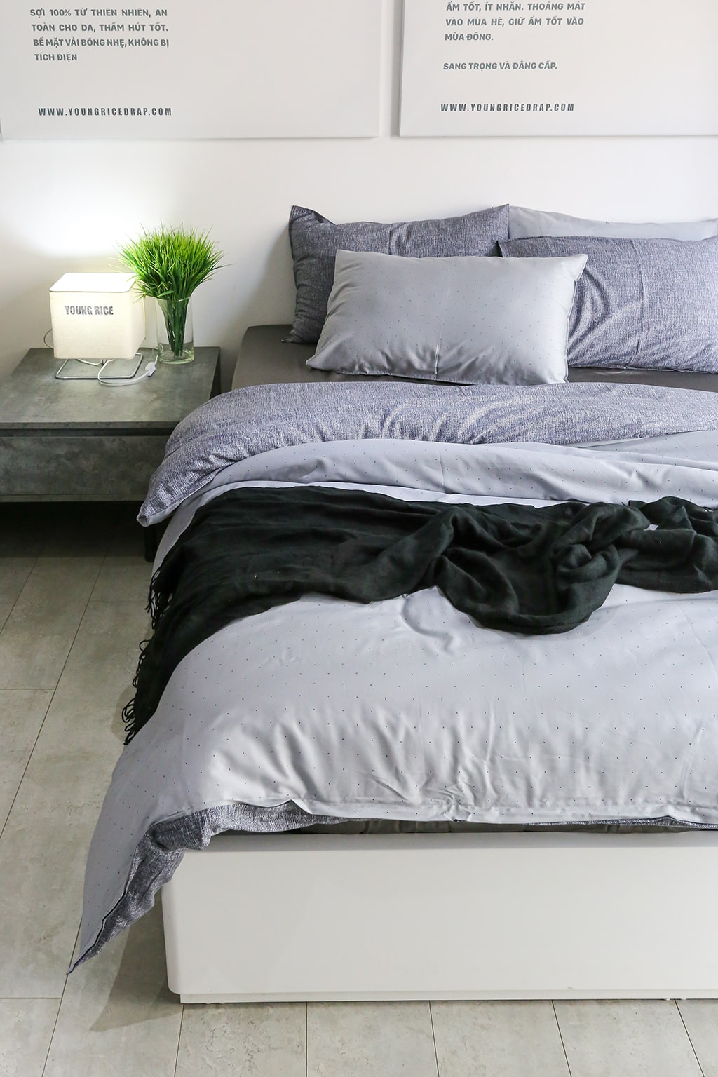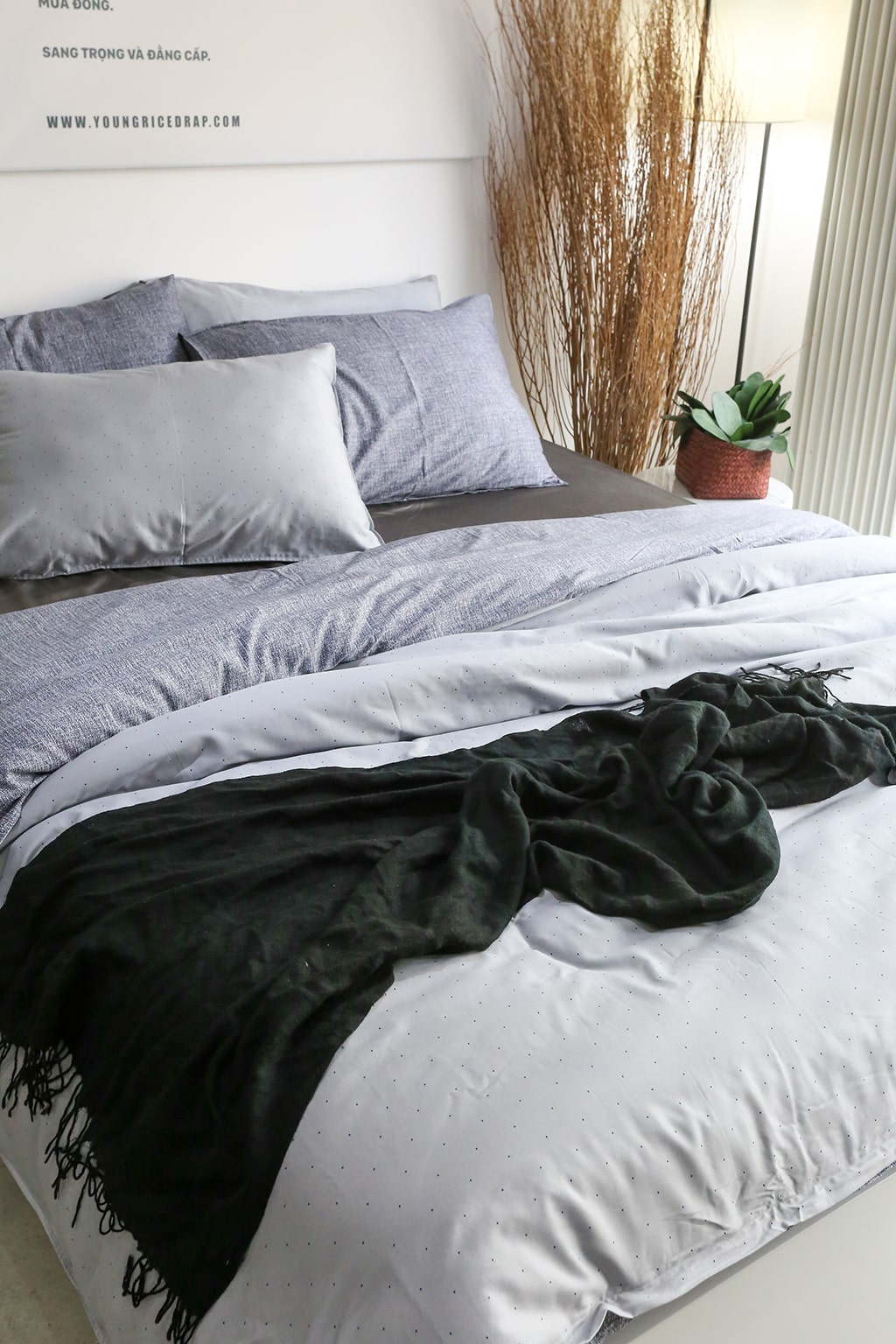 – 2 vỏ gối 50×70 cm : muối tiêu đen xám ( hoặc 1 vỏ gối ôm 37 x 105 cm)