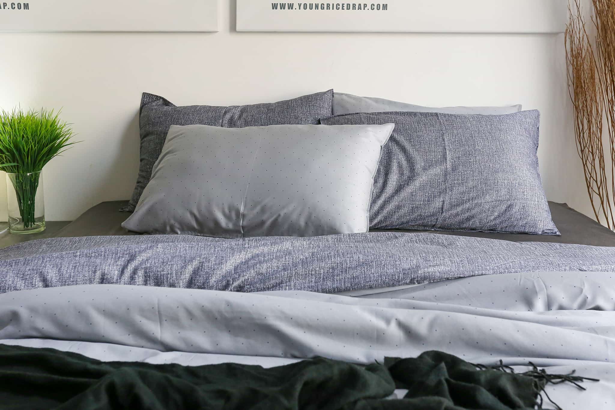 – 2 vỏ gối 50×70 cm: họa tiết chấm bi nền xám